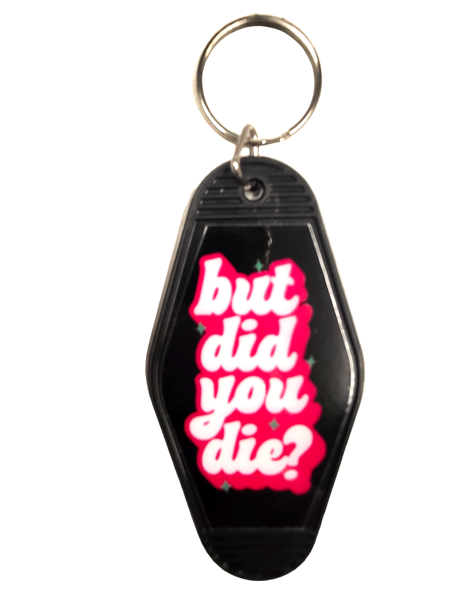 Add a touch of humor to your everyday life with the 'But Did You Die?' motel key chain. Made from durable materials and featuring a unique design, this key chain is a must-have accessory for anyone with a sense of humor. Get yours today and never lose your keys in style!