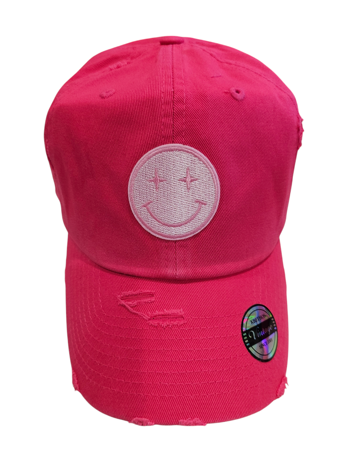 Add a touch of vintage charm to your look with this Hot Pink Vintage Embroidered Pink Smiley Ball Cap. The intricately embroidered design and fun pop of color make it a stylish choice for fashion-forward individuals. Elevate your outfit with this unique accessory today!