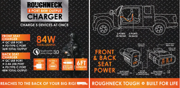 Charges 5 devices at once – 2 ports in front, 3 in back! Reaches to the back of your big rig! Roughneck 6FT front and backseat chargers feature bulletproof Kevlar construction and Qualcomm Quick Charge 3.0 technology. 84W total output. Standard USB. PD Type-C USB. Automobile auxiliary power outlet.