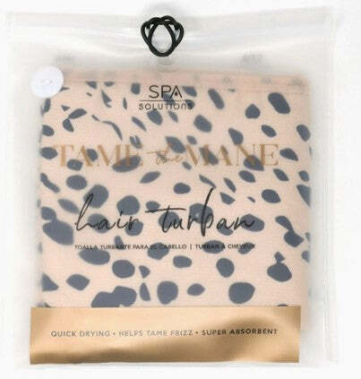Spa Solution CHEETAH Tame the Mane Hair Turban. Easily absorbs water for quick drying time. Helps tame frizz.